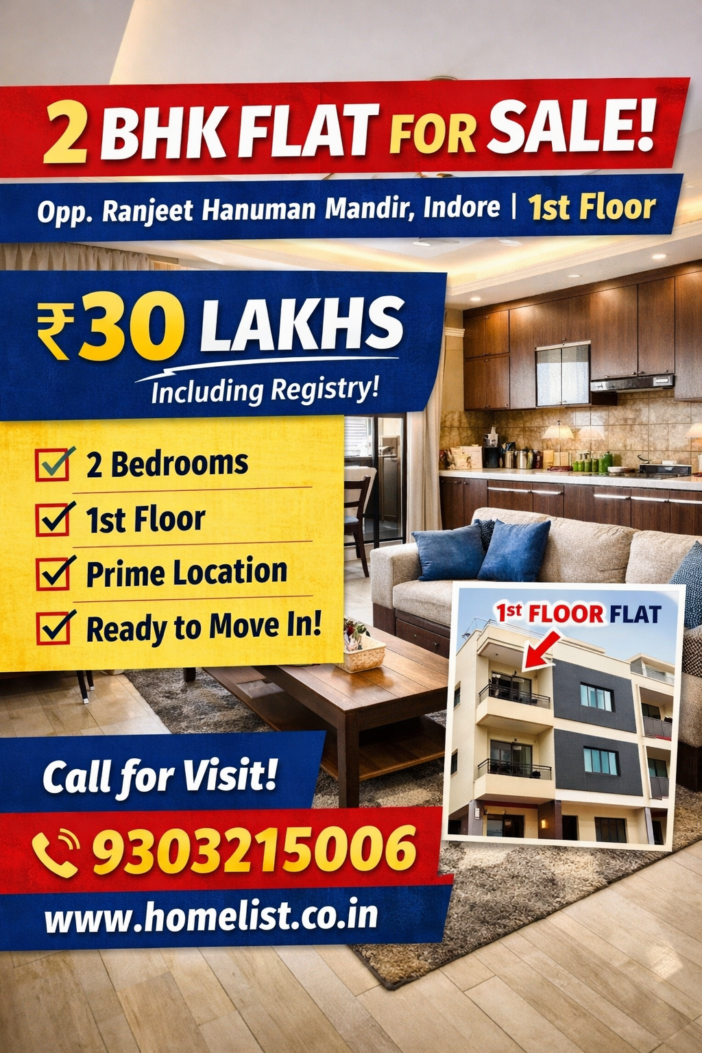 2 BHK Flat for Sale Opp. Ranjeet Hanuman Mandir, Indore | 1st Floor | ₹30 Lakhs (Registry Included)