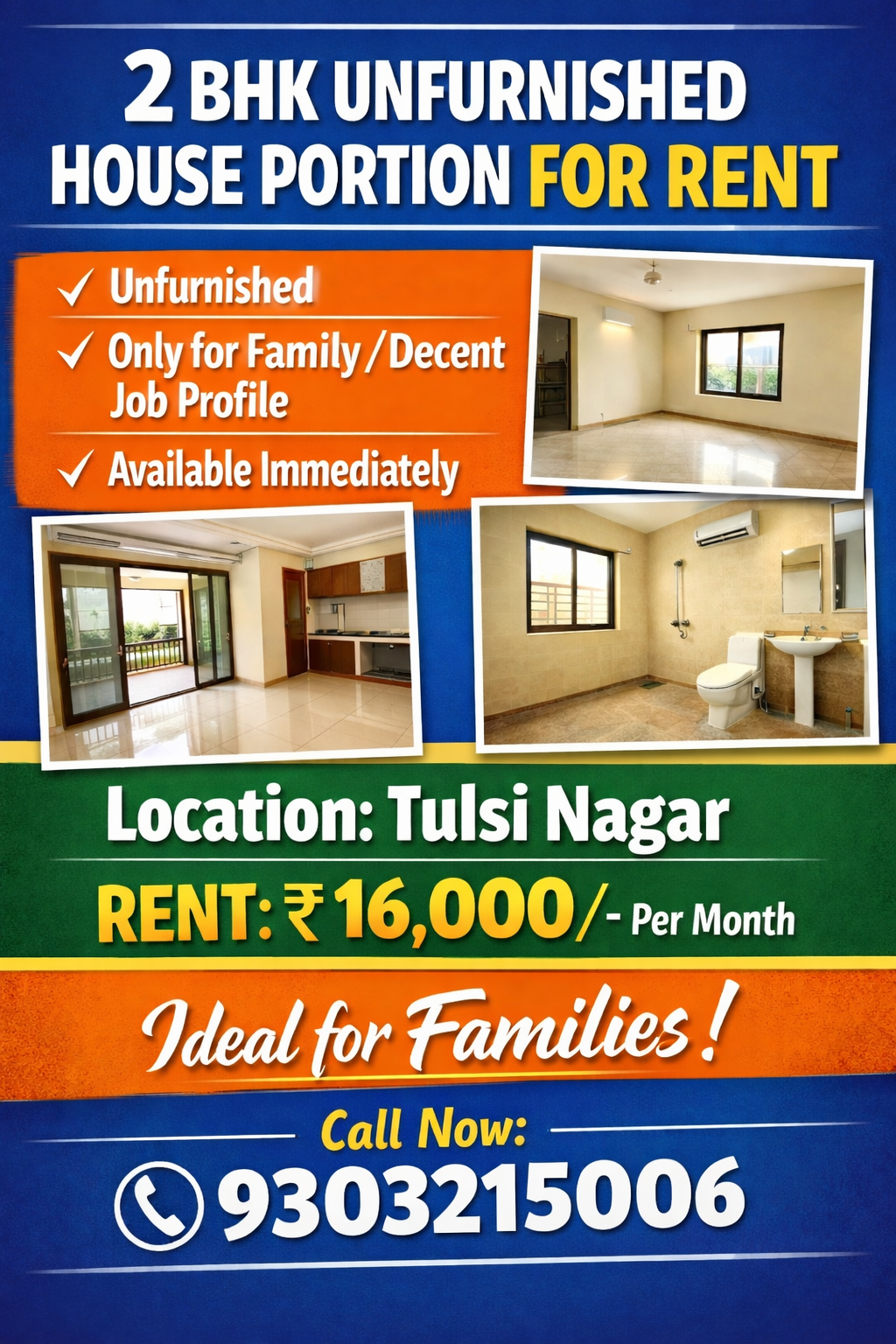 Description: Well-maintained 2 BHK unfurnished house portion available for rent in Tulsi Nagar. Ideal for families or individuals with a decent job profile. The property is ready to move in and offers a peaceful residential environment.
